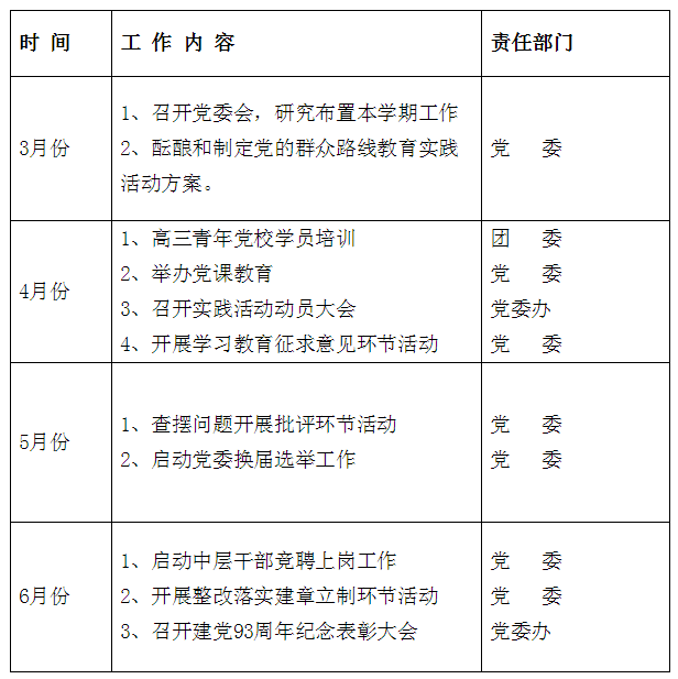 我校的教育实践活动大体安排8个月时间,9月底基本完成。坚持时间服从质量,采取统一部署、梯次展开、压茬进行的办法,党委带头开展教育实践活动,各支部依次有序推进。坚持问题导向,坚持教育实践并重,坚持边学边查边改,从始至终抓好学习教育和整改落实,使各个环节的工作有效衔接、相互贯通、有序推进。每一个环节都组织“回头看”,达不到标准要求坚决重来。