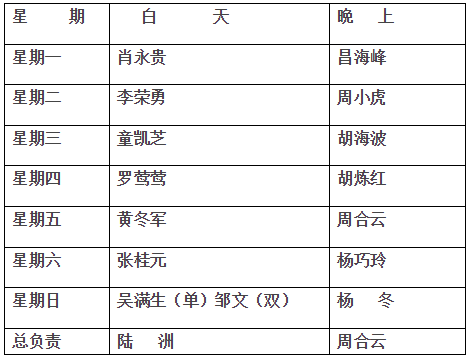 2017年上学期第7周工作安排 来源: 发布时间:2017-03-27 17:37:00 浏览次数: 次 【字体:小 大】 第7周工作安排:3月27日星期一:上午教研组长会;下午年级组长会3月28日星期二:上 课3月29日星期三:下午教研活动3月30日星期四: 下午教研活动3月31日星期五: 上 课4月1日星期六: 上班,补上星期一的课4月2日星期日: 清明节放假 行政值日: 总值日:黄 佳 分享到: 【打印正文】