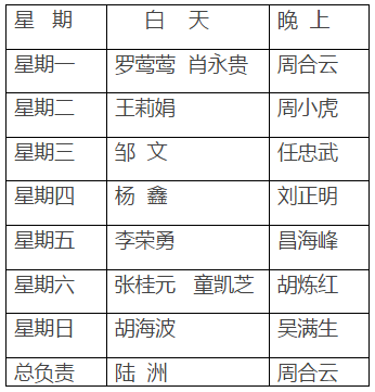 第7周工作安排 来源: 发布时间:2016-04-11 17:15:00 浏览次数: 次 【字体:小 大】 4月4日星期一: 清明节放假4月5日星期二: 上 课4月6日星期三:下午教研活动4月7日星期四:下午教研活动4月8日星期五: 上 课4月9日星期六: 休 息4月10日星期日:休 息 行政值日: 总值日:黄佳 分享到: 【打印正文】