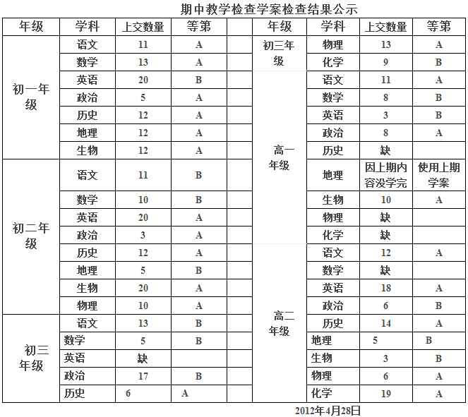 期中教学检查学案检查结果公示 来源: 发布时间:2012-08-08 09:42:00 浏览次数: 次 【字体:小 大】 教务处已经将学案检查结果公示三天,部分学科补交了学案,下表为期中学案检查最终稿。学校将以此为依据发放期中学案奖励。请老师们查对。 2011——2012年第二学期 分享到: 【打印正文】