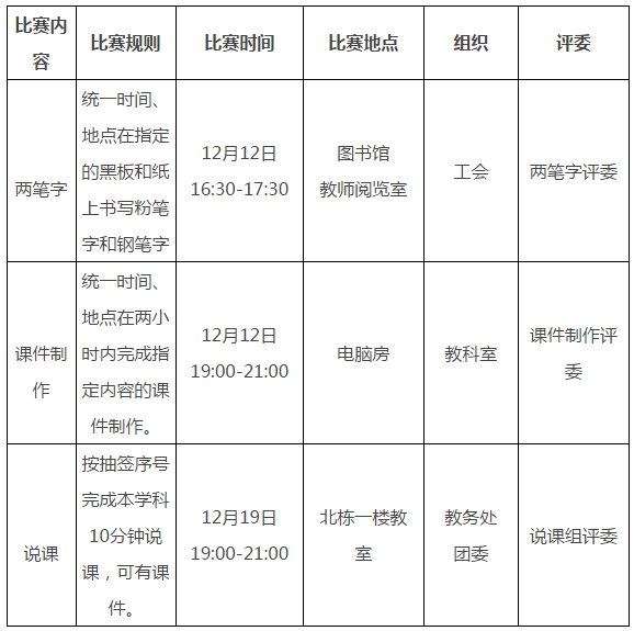 ⑵第二阶段:决赛。决赛为综合素质比赛,即40分钟完整课堂比赛(必须使用多媒体)。比赛时间为第十七周,具体安排另行通知。