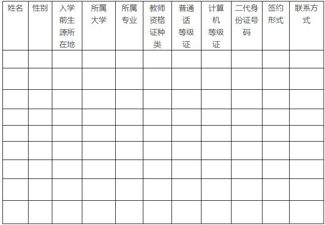 ②资格初审:毕业生的个人简历、二代身份证、毕业证、教师资格证、普通话等级证、计算机等级证、免费师范生就业协议书或意向协议书等相关证明材料。(来校报名带材料原件;电话报名发电子材料(含报名表和相关材料扫描件)到学校邮箱,初审合格后电话通知带材料原件参加招聘。)