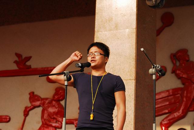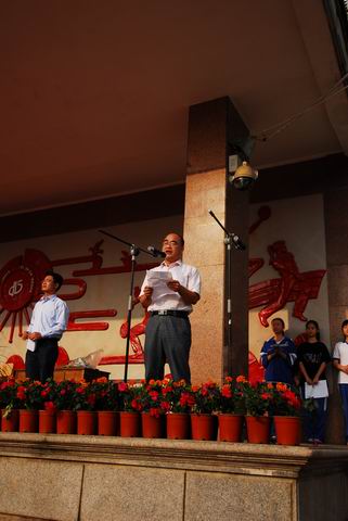 7:30,开幕式正式开始。主席台前端坐着学校领导:校长黄佳、党委书记刘世军、副校长张桂元、任忠武,纪委书记罗莺莺。学校几位老领导是特邀列席:陈守宁校长,杜家锐、黄德忠副校长,黎旦安关协主席。开幕式由教育处主任肖永贵主任主持。