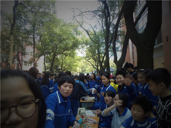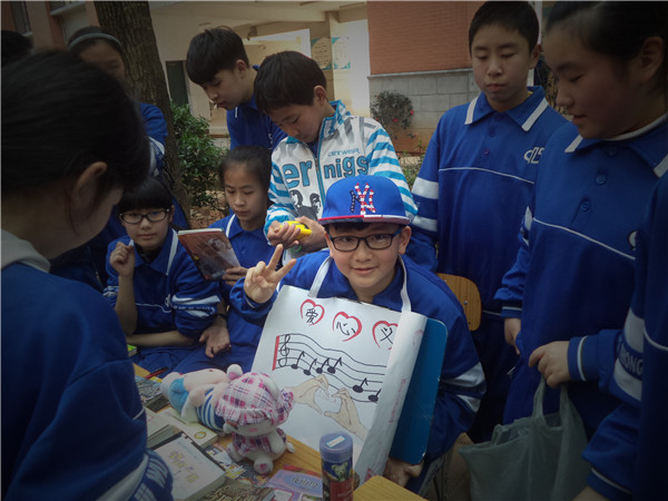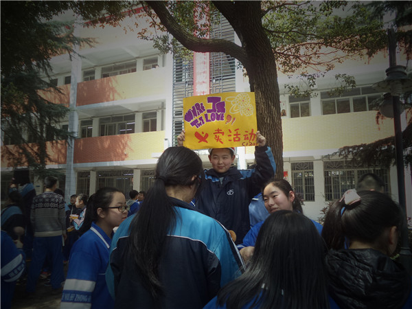 各班认真策划具有本班特色的义卖方案,并精心制作海报,想法独特新颖:除了义卖书本、文具,娃娃等物品之外,还独具匠心地开展了一元一次抽奖、二元一张合照、五元一次“献声”等活动。为筹集善款,各班同学使出浑身解数,为爱突破自我,大胆尝试假发、睡衣等造型来吸引同学们的眼球,尽己所能为义卖多收获一分!活动现场十分热闹,欢笑声是这次活动的主旋律。校园电视台的同学拍下了一幕又一幕生动的画面,画面中的一张张笑脸都是如此真挚!