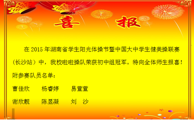 喜报:我校啦啦操队荣获湖南省阳光体操节暨中国大中学生健美操联赛初中组冠军