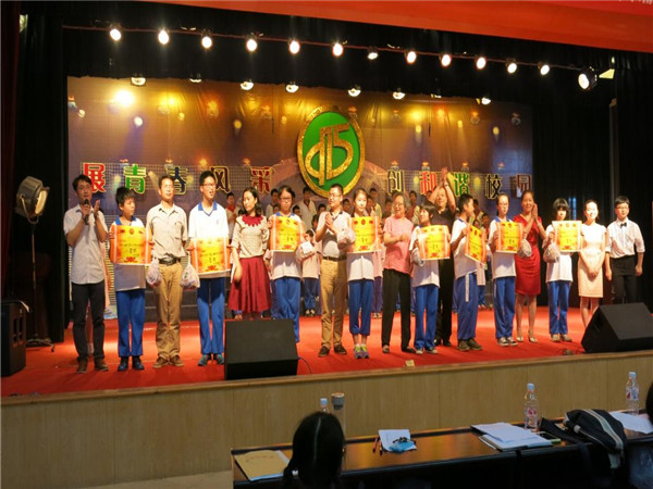 欣赏完精彩纷程的节目后,年级组长张丽发表讲话,她向全体同学提出了三个要求。团委胡书记也表示,今天要将团旗传递下去,并号召同学们心中要有旗帜、有目标。最后胡书记邀请各位领导颁发各班节目获奖奖状并代表全校的共青团员给每位初一同学发放了节日礼物。在庄严的退队仪式中,在丰富多彩的节目分享中,我校全体初一学生度过了一个快乐而有意义的”六一儿童节”。