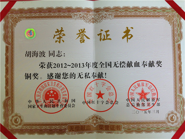 我校教师坚持用实际行动表达了对公益事业的支持和对社会的大爱,学校多位老师多次献血,其中胡海波老师工作以来坚持献血13次累计达5200毫升,获得了国家卫计委、中国红十字总会、解放军总后勤部联合颁发的“全国无偿献血奉献奖铜奖”的荣誉证书。老师们用自己的热血抒写了爱的篇章,展现了人民教师的浓浓爱心。一袋袋带着体温的鲜血,更彰显了十五中人甘于奉献、乐于奉献的强烈社会责任感和时代使命感!