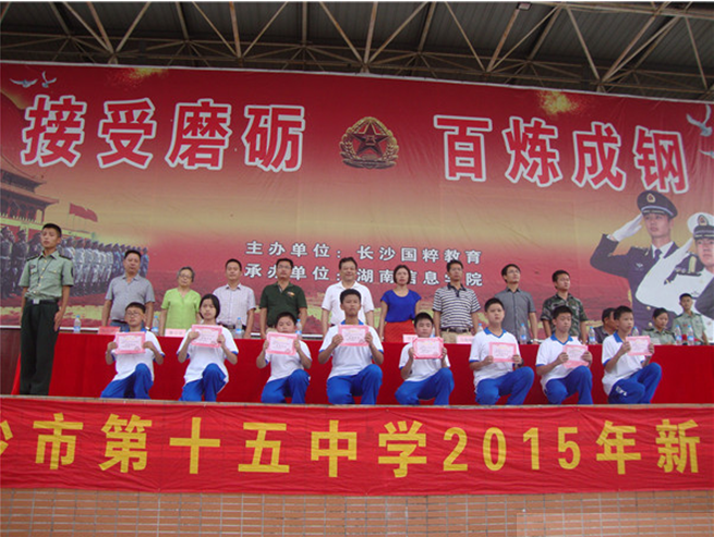 学校党委书记刘世军、纪委书记罗莺莺、教育处主任肖永贵、教育处副主任昌海峰、教务处副主任童凯芝、团委书记胡海波、关工委黎旦安主席、年级组长杨汉林老师、长沙市开福区国防教育基地梁主任、刘主任,初一年级全体班主任和军训教官以及2015级全体新生出席了结营仪式。