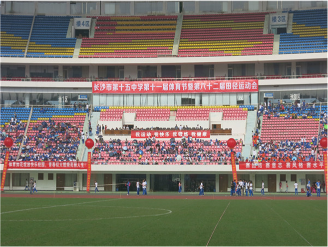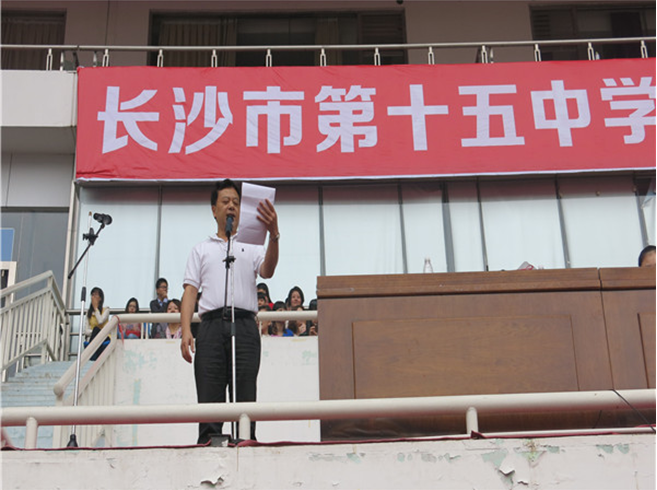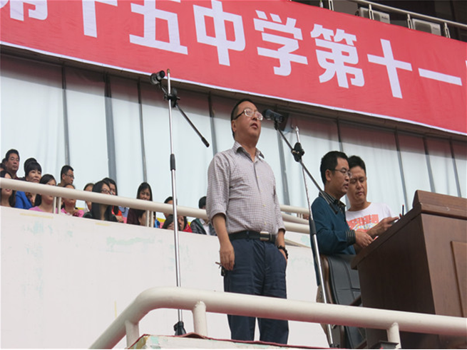 早上8点,教育处肖永贵主任宣布运动会入场式开始,伴随着雄壮的《运动员进行曲》,校国旗队、校旗队、牌匾队、彩旗队、鲜花队、女足表演队、羽毛球表演队、啦啦操表演队依次步入会场。在他们的引领下,各年级各班队伍神采奕奕、精神饱满地踏入田径场,走向主席台接受检阅。在庄严而激昂的音乐声里,各个班级八仙过海各显神通,以精心编排的队列有序地向主席台致敬。挥舞的荧光棒、独具风格的服饰、色彩缤纷的气球、响亮的班级口号,张扬着十五中学子的个性,更充分体现了十五学子“追求卓越,以人为本”的精神面貌和“阳光体育,快乐成长”的运动精神。