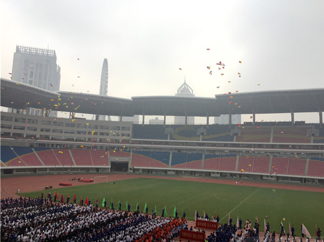 黄佳校长朗声宣布第11届体育节暨第62届田径运动会正式开始。在五彩高飞的气球和热烈的欢呼声中,开幕式走向高潮,本次校运会赛程也正式拉开序幕。让我们在为期两天的校运动会赛场上超越梦想、放飞青春、燃烧激情、追求卓越!运动,让我们的生命更加精彩!