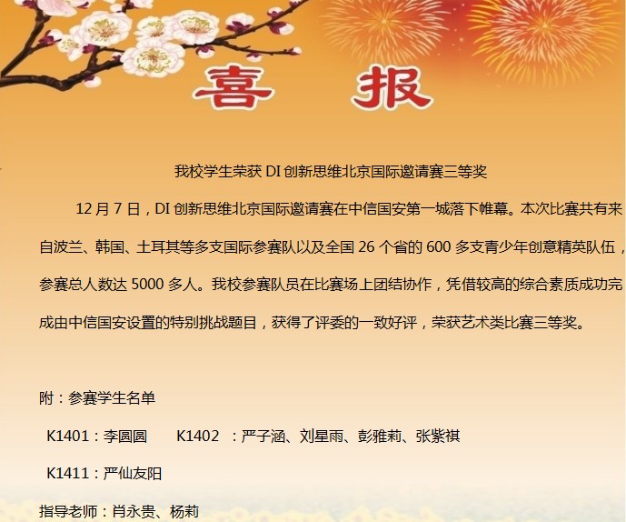 喜报:我校学生荣获DI创新思维北京国际邀请赛三等奖