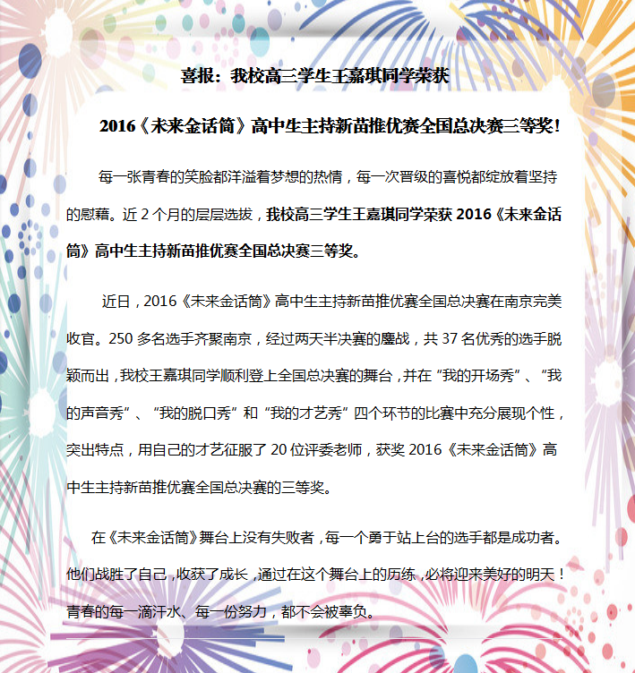 喜报:我校高三学生王嘉琪同学荣获
