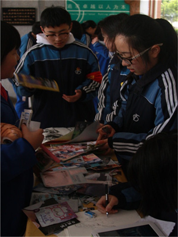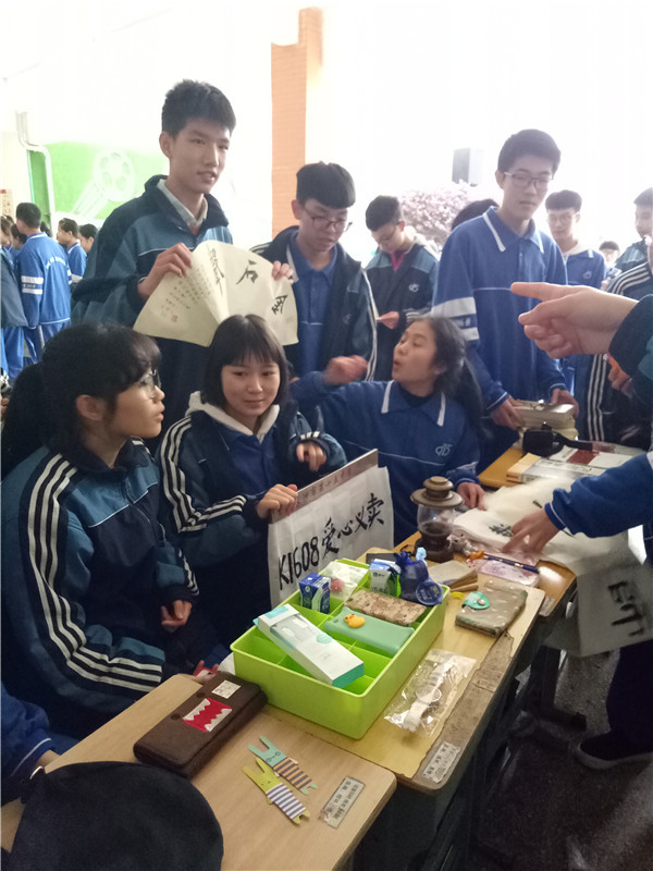 中午十二点四十,在南栋教学楼架空层,同学们陆陆续续地搬着自己的桌椅和商品进场。每个班级都精心制作了班级宣传海报,有着个性十足的风格和主题。每个班级的桌面上摆放着各种各样的精美的商品,有自制的书签和明信片,小巧而精致;有毛绒娃娃,柔软而可爱;有书桌摆件,品种丰富;也有各种类型的书籍,供同学们和老师们挑选。每个班级负责推销的同学卖力地推荐自己的产品,在场的同学也无不兴奋激动。同学们不亦乐乎,场面热闹非凡。