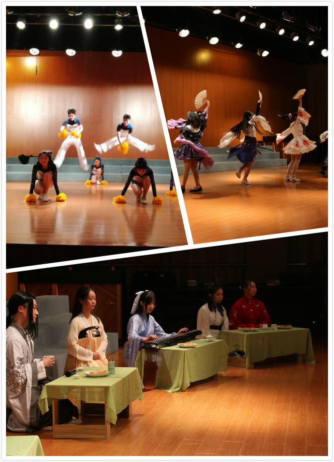 文艺汇演在青春动感的啦啦操舞姿中拉开了序幕,商业模拟协会带来的《贵族礼仪&T台秀》,表演者们身着华丽的衣裳,举止优雅,散发出欧洲贵族特有的气息;嘻研社带来的歌曲《圣诞节》,不仅沿袭了美国潮流hiphop,同时也恰如其分地加入了中国元素;言叶动漫社带来的《将进酒》将中国诗词与动漫文化完美融合;弦墨汉风社的原创歌舞剧《礼仪之邦》让我们充分感受了中华名族礼仪的博大精深和无穷魅力;X power韩舞社带来的《not today》,动感十足,将舞蹈的魅力发挥得淋漓尽致,更是将现场的气氛推向高潮。