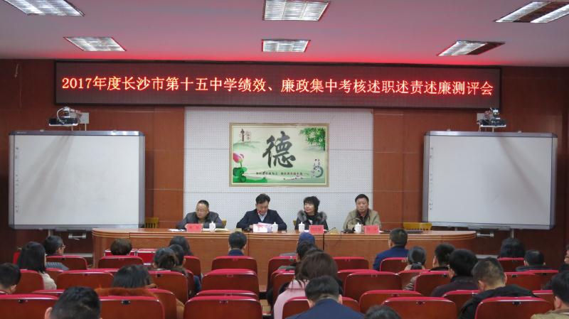 2018年1月15日下午,我校在办公楼二楼报告厅召开2017年度绩效、廉政集中考核述职述责述廉测评会,迎接市教育局绩效考核和落实党风廉政建设检查考核。学校领导班子全体成员以及教职工代表共60人参加了此次会议,会议由党委书记陆洲主持。以长沙市教育局机关党委书记胡慎信为组长的绩效考核工作小组一行9人莅临我校检查指导工作。